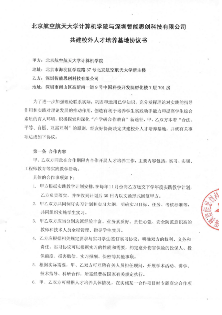 9月13日,智能思創與北京航空航天大學簽訂了共建校外人才基地協議。雙方同意在合作期限內合作開展人才培養工作,主要內容包括∶實習、實訓、工程師教育等實踐教學活動,積極探索和深化“產學研合作教育”新途徑。